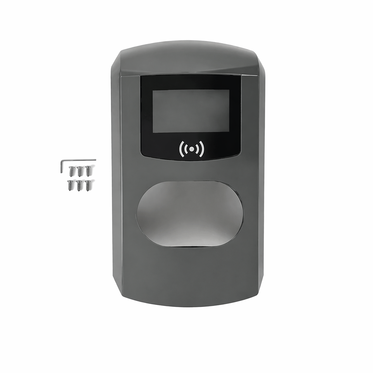 Op de foto staat een complete grijze lader afgebeeld. Het front wordt geleverd zonder outlet of een klep voor de outlet. Het front heeft een uitsparing voor de outlet die in de lader zelf is ingebouwd.