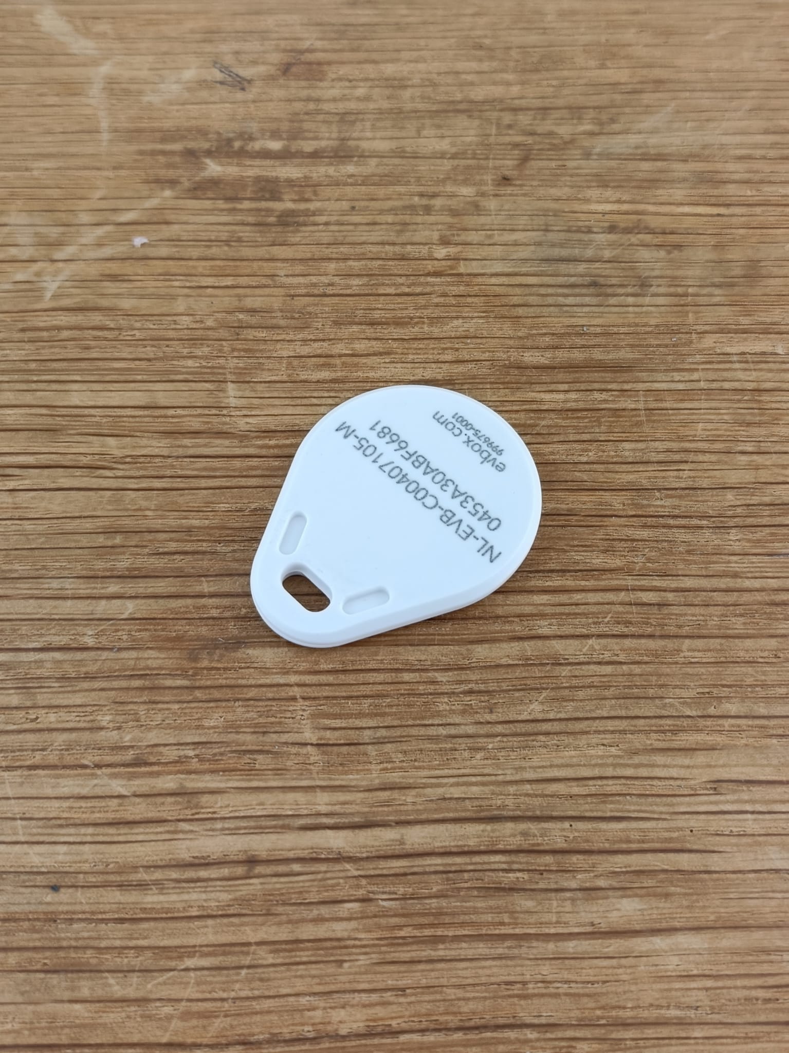De RFID-tag is wit en ziet eruit als een sleutelhanger. Deze is voorzien van het EVBox-logo aan de voorzijde en op de achterzijde een uniek serienummer dat wordt gebruikt bij de registratie.