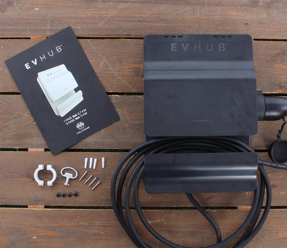 Handig aan de laders van EVHUB is de ingebouwde (onderdeel van het design van de lader) haspel waaraan u uw kabel mooi en netjes kunt ophangen. Aan de zijkant van de lader is een stekkerhouder aanwezig waarmee u uw laadstekker gemakkelijk kunt plaatsen zonder dat deze vies wordt gedurende de tijd dat u niet laadt.