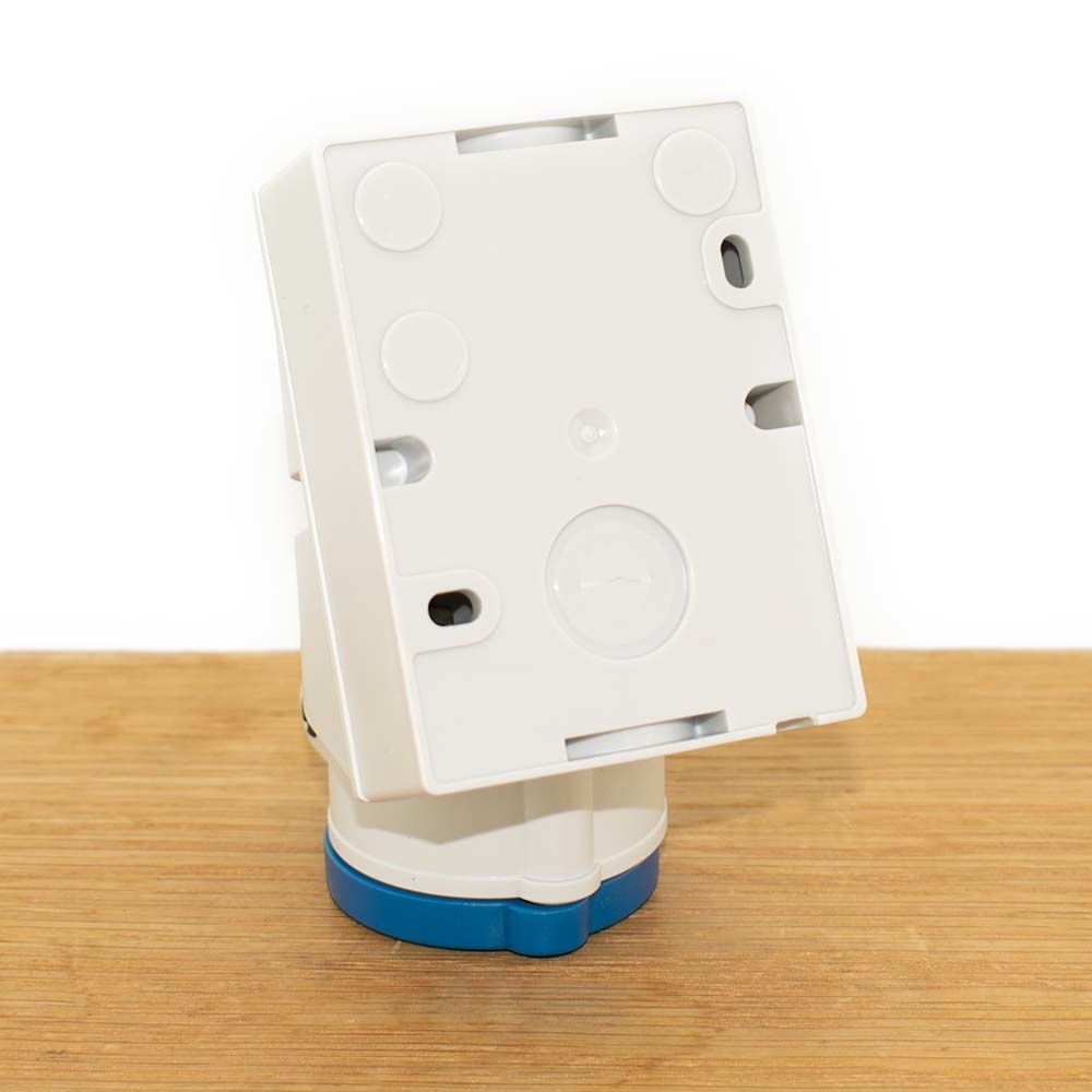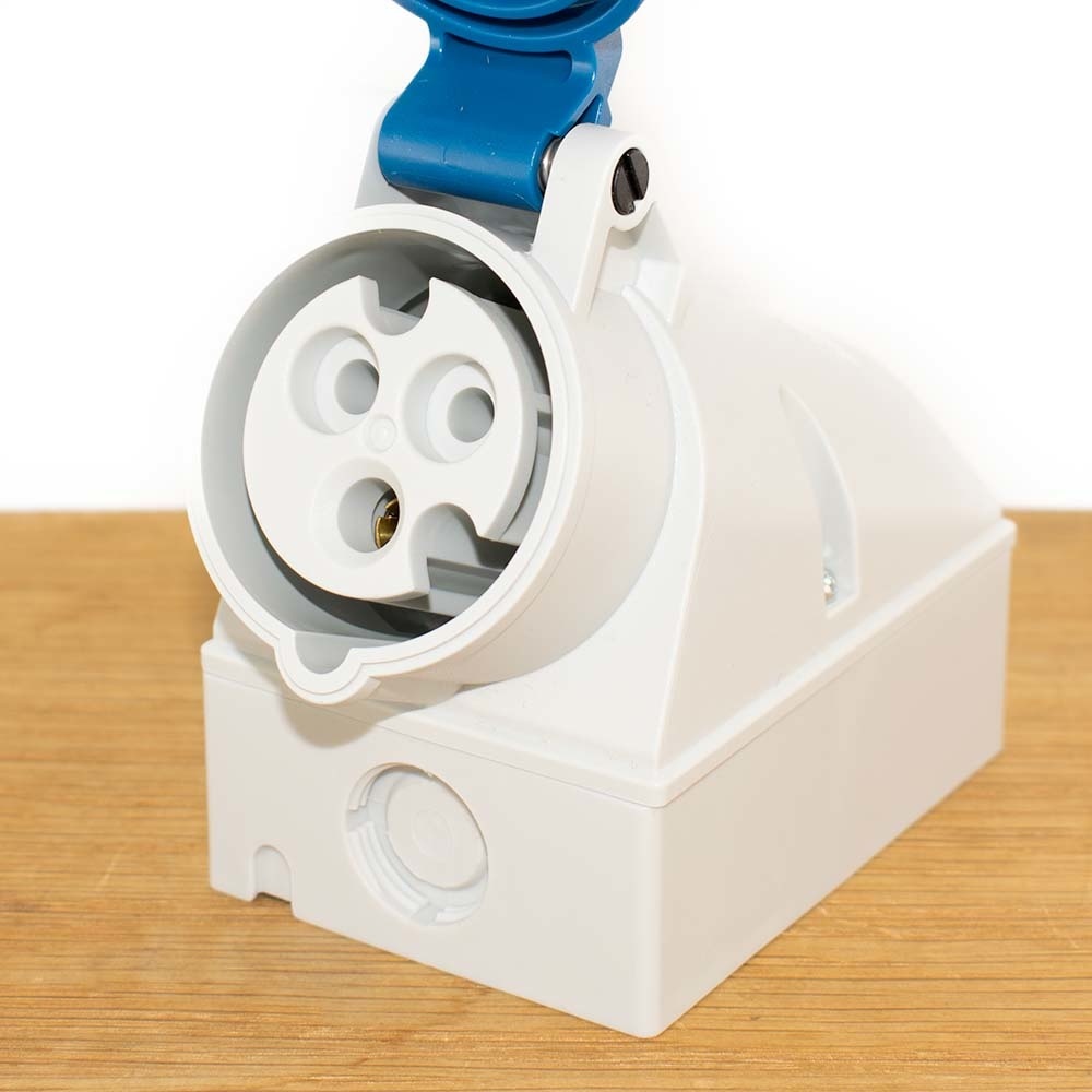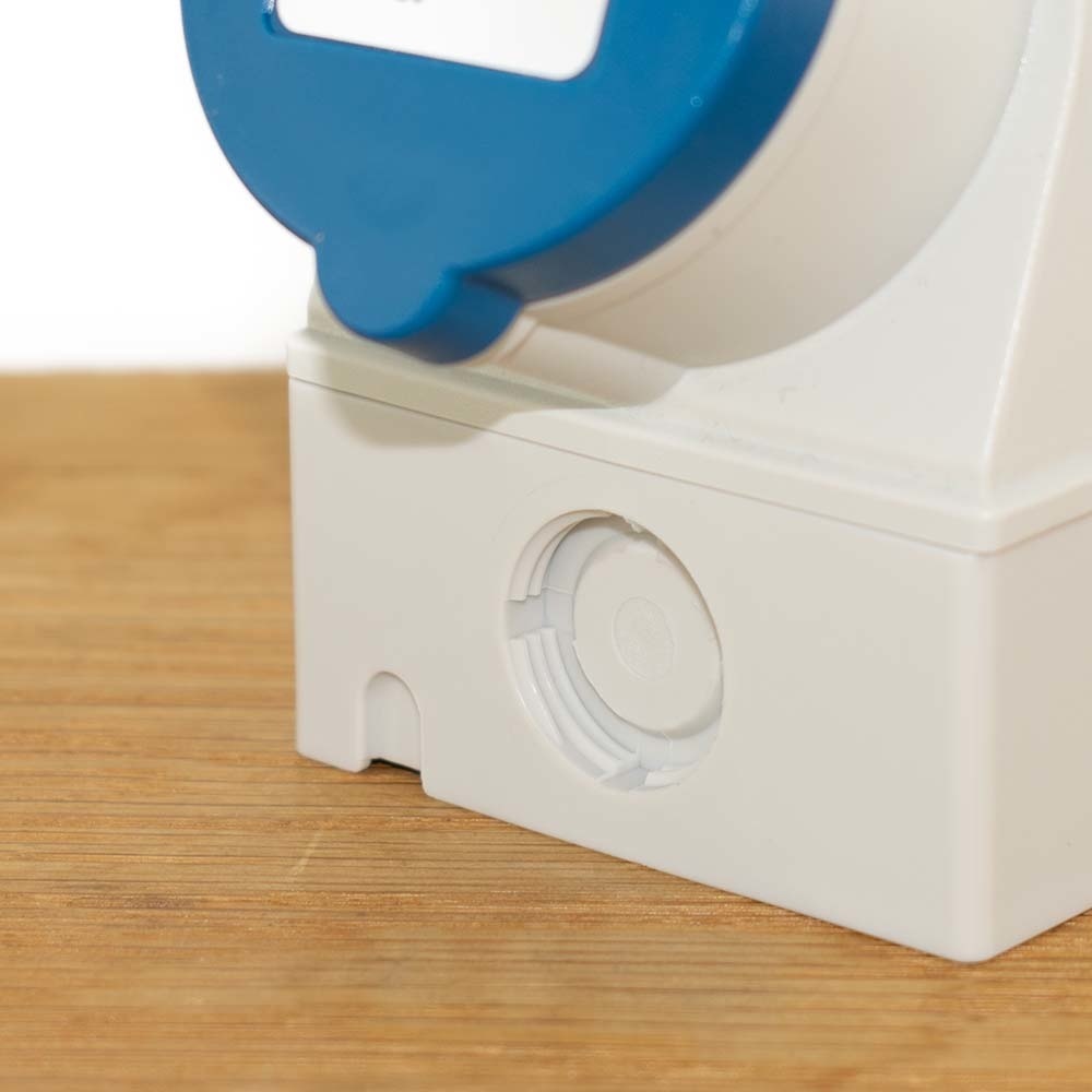 De wandcontactdoos heeft een blauwe afsluitdeksel met een veer die het contact afsluit als er geen stekker op is aangesloten.