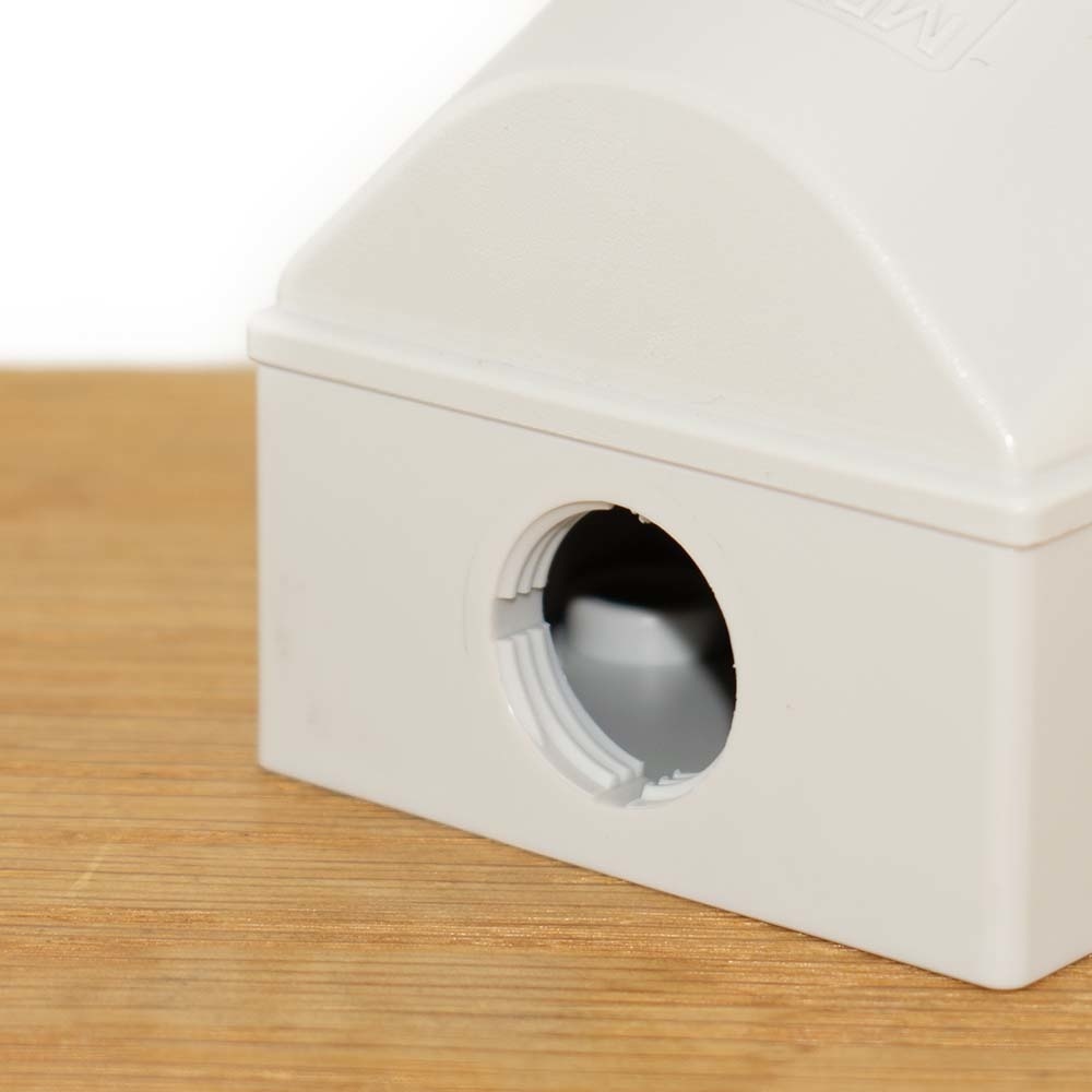 Aan de achterkant/ bovenkant is een kabeldoorvoer aanwezig. Aan de onderzijde van de wandcontactdoos is ook een kabeldoorvoer te maken. Hiervoor dient dan het ronde kapje weggedrukt te worden of een gat geboord te worden.