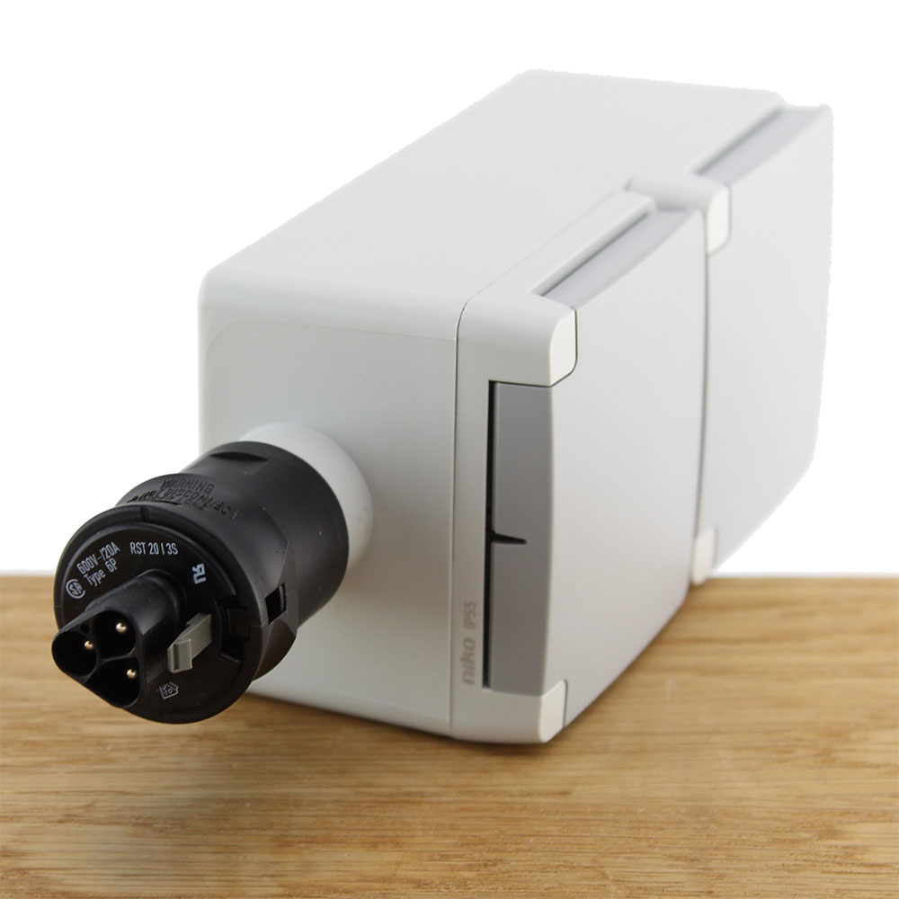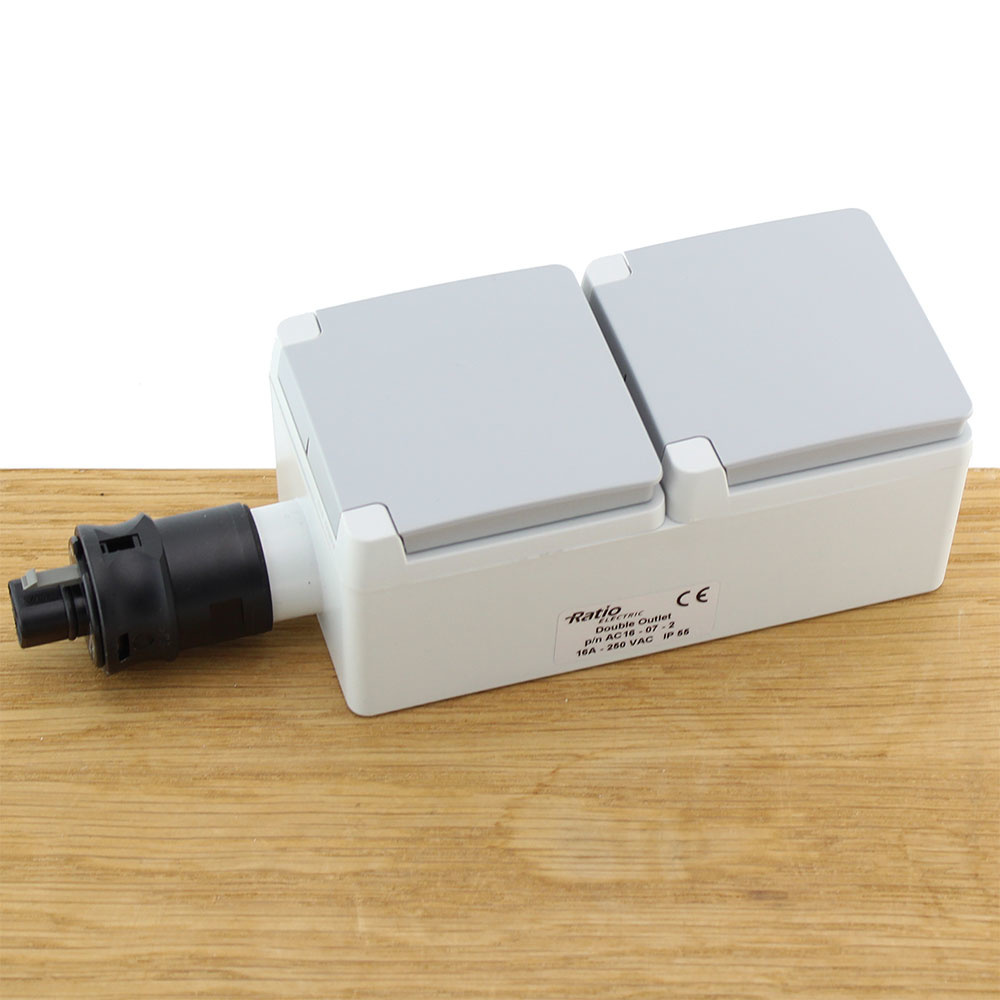 Dubbelvoudige wandcontactdoos voor het walstroomsysteem AC16 van Ratio Electric. Isolatieklasse IP55: spuitwaterdicht en daarmee geschikt voor een stroomsysteem nabij het water. Geschikt voor maximaal 16A / 230V. De kleur van deze kunststof Schuko outlet is gebroken wit.